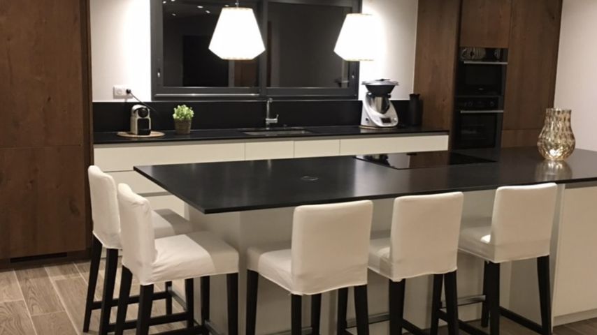 Four, four à micro-ondes, lave-vaisselle, grande plaque de cuisson à induction 4 foyers, hotte (pilotée depuis la plaque de cuisson), robot Thermomix